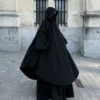 Ce modèle unique se distingue par sa grande capuche qui tombe sur les épaules, deux poches latérales et une longue fermeture éclair au milieu. sa coupe très large a été ajuster sur les côtés grâce à deux cordon qu’on peu resserrer , lui donnant un air de la Abaya Imany, tout en conservant un aspect ample.